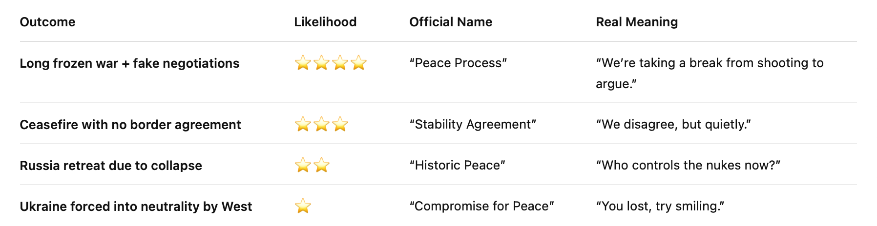 The Ministry has recently conducted a forensic audit of all “peace negotiations” between Russia, Ukraine, the United States, and their respective cheerleading sections. The analysis concludes: